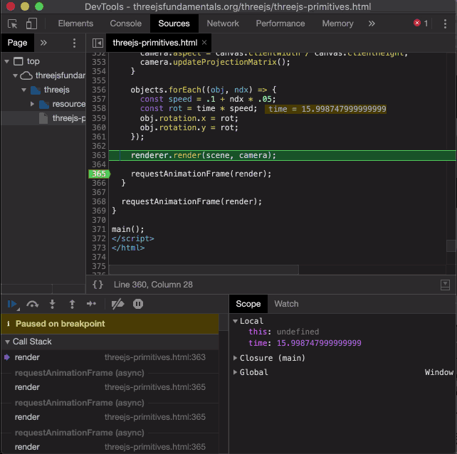 my call to renderer.render(scene, camera) and then start expanding